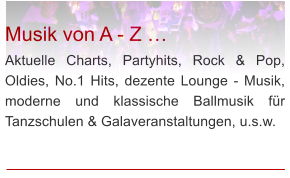 Aktuelle    Charts,    Partyhits,    Rock    &    Pop, Oldies,   No.1   Hits,   dezente   Lounge   -   Musik, moderne     und     klassische     Ballmusik     für Tanzschulen & Galaveranstaltungen, u.s.w.